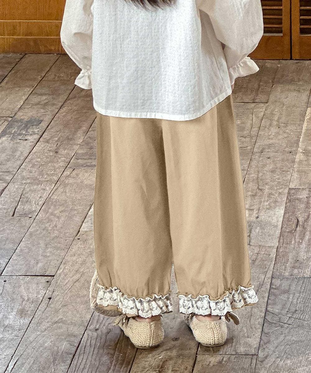 裾部分に施されたレースが特徴のキッズパンツ。ナチュラルな色合いとシンプルなデザインで、どんなトップスにも合わせやすい一枚です。ウエスト部分はゴム仕様で、着脱が簡単。ほどよい丈感が可愛らしさと実用性を兼ね備えています。