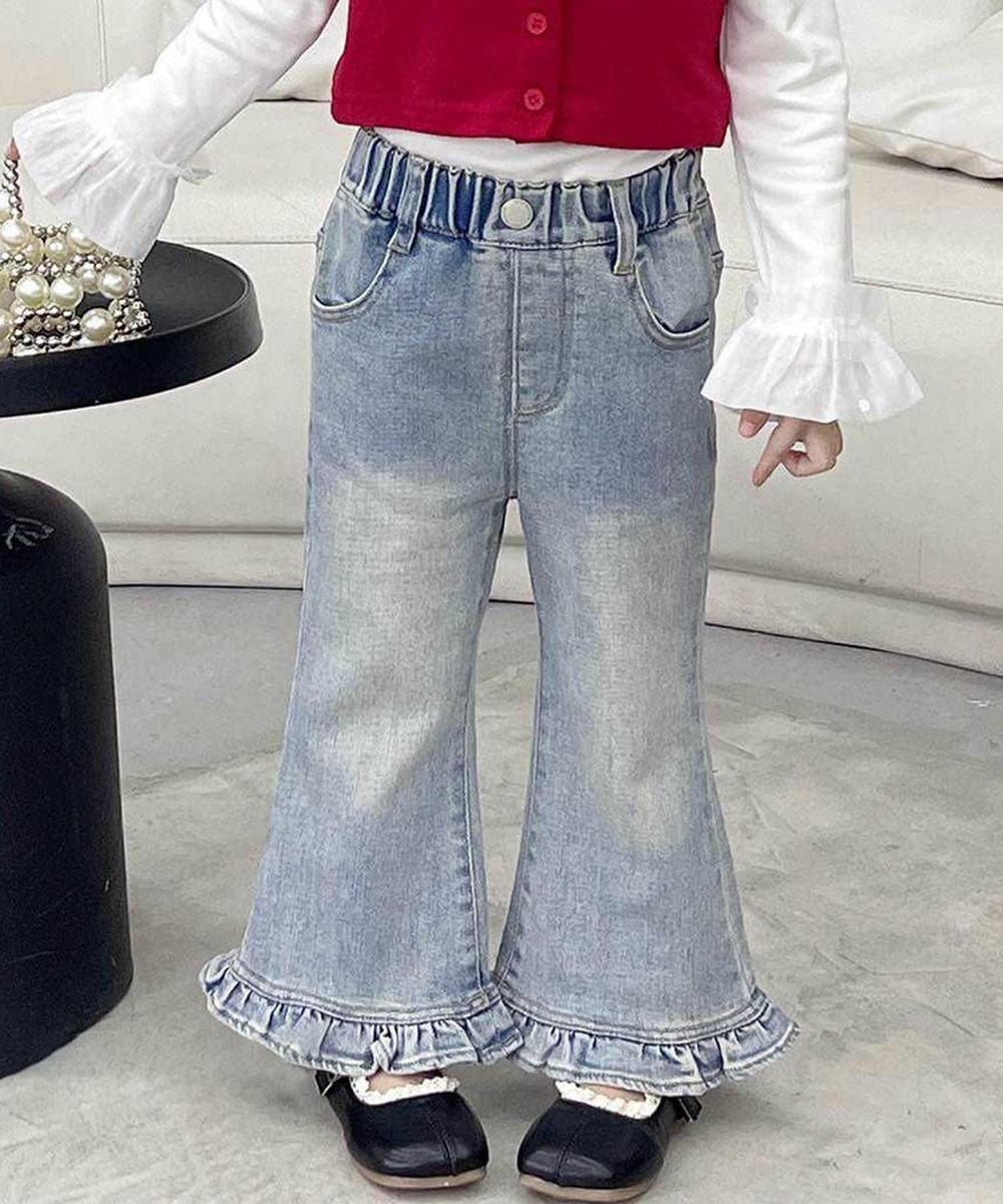 裾に施されたフリルデザインが特徴のキッズデニムパンツ。柔らかなフレアシルエットで、動くたびに可愛らしさが際立つ一枚です。カジュアルなデニム生地に、フェミニンな要素をプラスしたデザインが魅力。