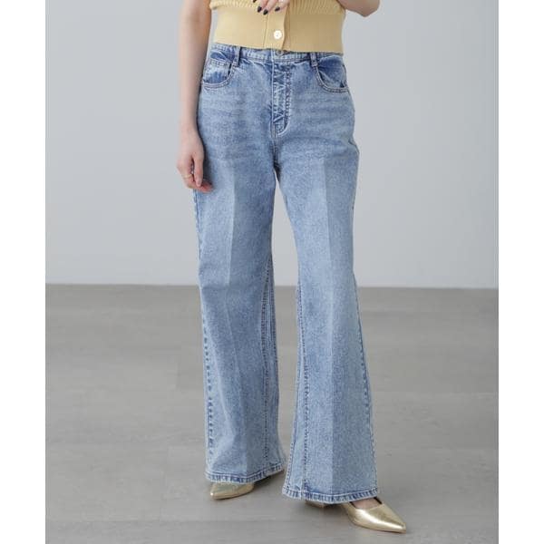 ストレッチデニムを使用した穿き心地の良いフレアデニムパンツ。センタープレスと太すぎず程よいセミワイドフレアのシルエットで、スタイルアップ効果を期待できる1本。ひざ下内側に三角切替をプラスし、アクセントにしています。スウェットなどのカジュアルなアイテムにも、フェミニンなトップスにも合わせやすく、幅広い着こなしを楽しめます。※モデルの着用画像の場合、光の当たり具合により、実際の色味と異なって見えることがございます。色味は、商品単体の画像をご参照ください。