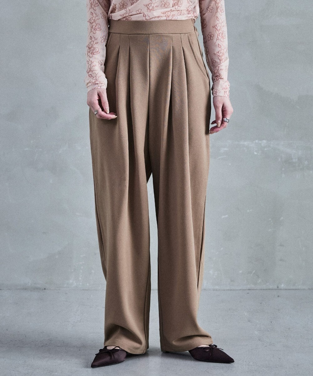 ゆるっとワイドなシルエットとフロントのタックで、モードスタイルにもカジュアルコーデにも。