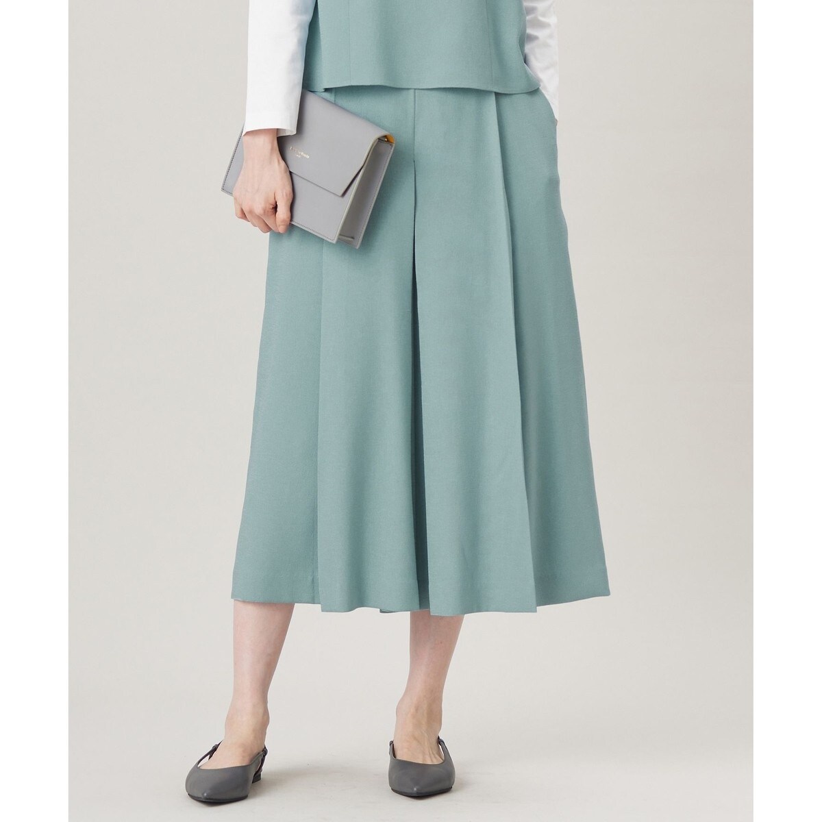 フレアシルエットでスカート見えするキュロットパンツ■デザインスカートのように見えるキュロットタイプのフレアパンツです。前にボックスタックを入れているため脚のラインを拾いにくく、パンツでありながらスカートのようにも見えるのでエレガントで女性らしいデザインです。ウエストの後ろ部分はゴム仕様になっているため、快適な着心地もポイントです。同素材のジャケットやビスチェと合わせてセットアップで着て頂くのもおすすめです。■素材麻見えを意識して作られた合成繊維素材です。スラブ調の糸を使用して表面に凹凸感を出し、よりナチュラルな天然素材の表情を実現しています。ストレッチ入りで着心地が良く、さらりとしたタッチと軽さ、通気性が特徴です。シワが目立ちにくく、キレイ見えし、接触冷感機能付きなのもポイントです。■同素材アイテムテーラードジャケット(JKW7GM0302)ワイドストレートパンツ(PRW7GM0302)ビスチェ(BLW7GM0302)