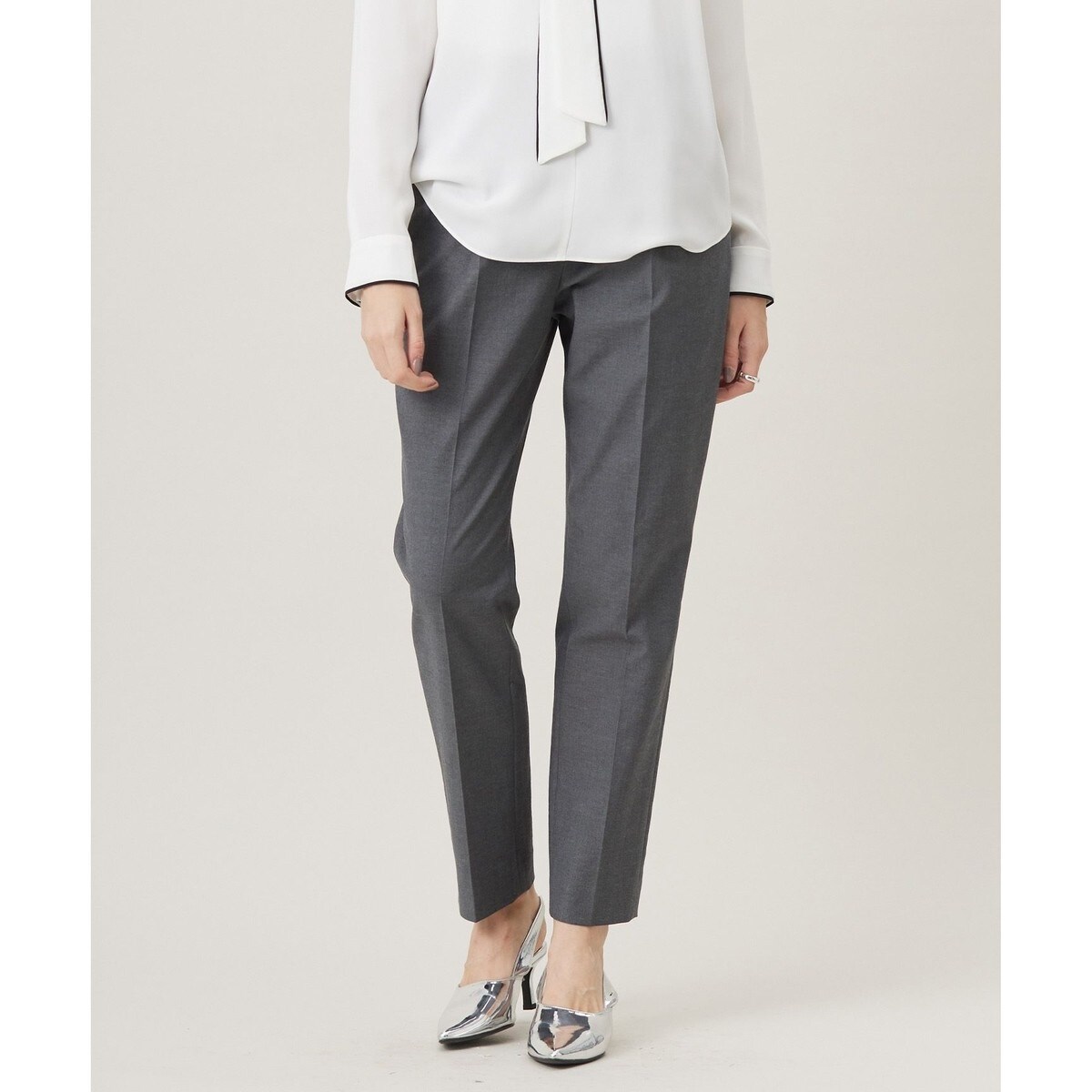 ■デザイン2タックデザインでセンタープレス入りのテーパードパンツ。ウエストのタックによりヒップ回りに程良いゆとりが生まれ穿きやすく、裾に向かってのテーパードシルエットで脚がキレイに見えるデザインです。ウエスト部分はゴム内蔵のスマートバック仕様で、アジャスターデザインもポイントになっています。単品使いはもちろん、同シリーズのジャケットとのセットアップ着用もおすすめです。