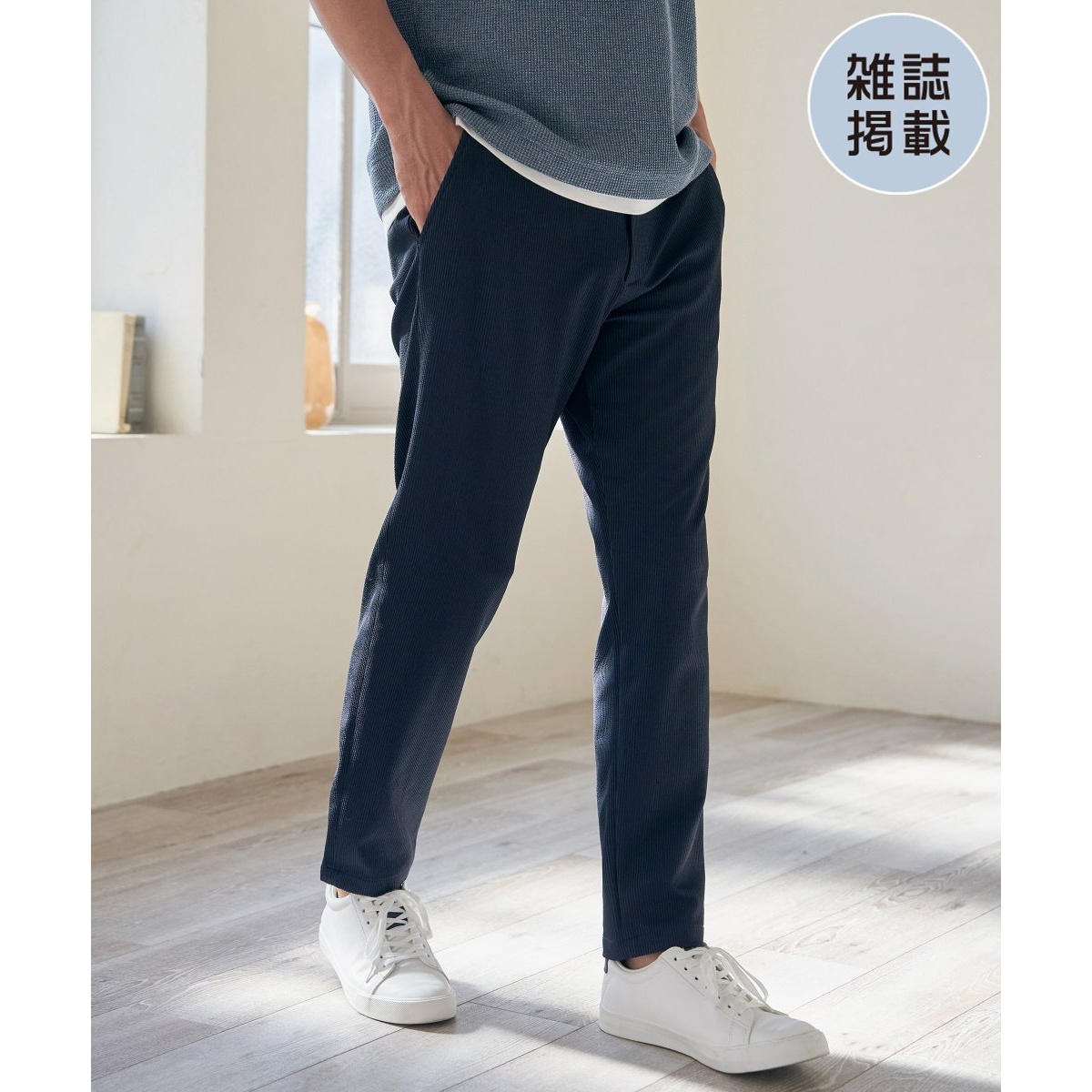前身頃にゴムシャーリングが見えない、オンオフ兼用のイージーパンツ。
