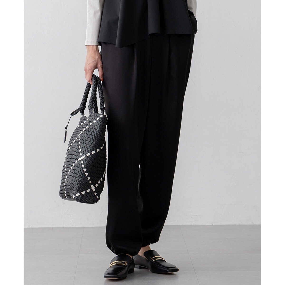 トレンドのボリューム感あるバレルシルエットをベースにしたドロストパンツ。サテン素材を使用しているため、サテンならではの光沢とドレープ性がカジュアルダウンしすぎず、上品に穿きこなせるアイテムです。ウエスト部分にデザインが入っているのでインスタイルや、コンパクトなニットともバランス良く着用していただけます。また裾を絞ることができるため、スタイリングによってシルエットを変えて楽しんでいただけます。カラーはシックな印象のブラック(#005)、柔らかな艶感が魅力のベージュ(#033)、ニュアンス感のあるカーキ(#054)の3色展開です。