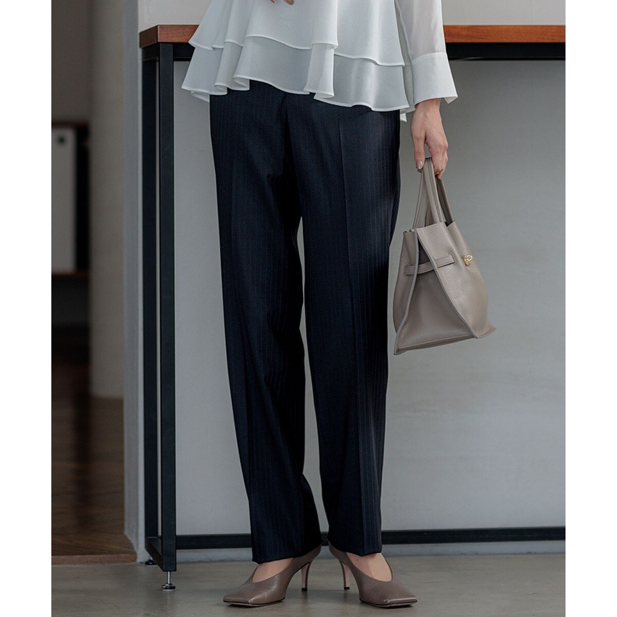 すっきりとしたシルエットのテーパードパンツ。脚を美しく見せるシルエットにこだわった1本。ジャケットとスタイリングした時にバランスの良いレングスに仕上げています。カラーはベーシックな無地のブラック(#005)、上品な印象のネイビーストライプ(#175)、洗練された印象のライトグレー(#003)を追加した3色展開です。