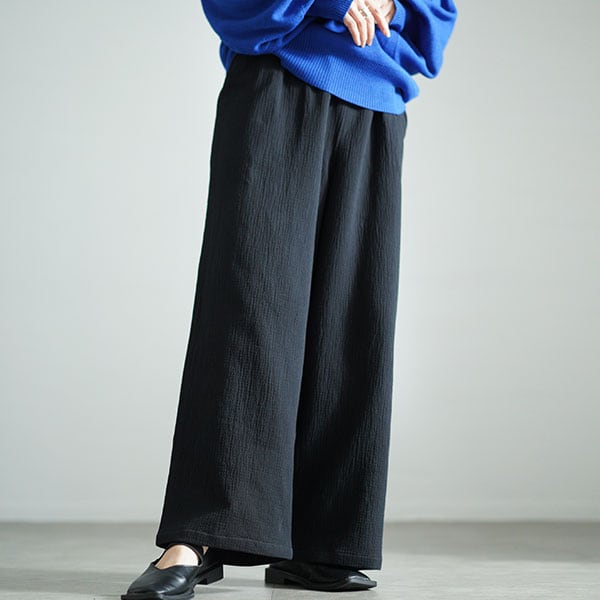 着膨れしない裏起毛でハンサムレディに仕上がるワイドパンツは、毛足の短い起毛感のある裏地で仕立てられ、ワイド幅でゆったりとリラクシーな穿き心地。ウエストゴム仕様で窮屈感を感じさせず、プラス5℃以上のヒート機能付きだから穿くだけで暖か。寒い季節のマストアイテムに。シボ感のある楊柳生地が風合いあるシルエットを演出し、毛玉になりにくく、いつでも新調したかのように綺麗見えが続きます。静電性もあるから、乾燥する季節にも嬉しい逸品です。