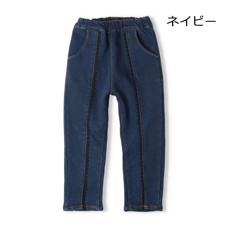 裏がベロア素材で暖かいデニムパンツ、長ズボン。ネイビーは縦にレース使い裾スリット、ブルーはお花の刺繍デザイン。カラーによってデザインが異なります。どちらもどんなコーデにも合わせやすい万能アイテム。【アイテム】ナチュラル シンプル ベーシック フェミニン ガーリー 無地 カジュアル お洒落 オシャレ かわいい 大人可愛い 普段着 デイリーウェア お出かけ着 お外着 外遊び着 ロング丈 長丈 長ズボン フル丈 ボトムス 子ども こども 女児 女の子 ガールズ キッズ ベビーサイズ トドラーサイズ 幼稚園 保育園 小学校 通園 通学 小学生 2024年秋冬物新作 丸高衣料 ジーパン Gパン ジーンズ 長パンツ クレセント ネイビー 紺色 ブルー 青色