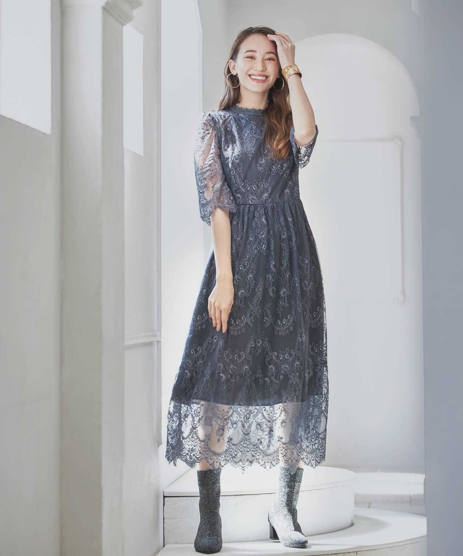 AIMER スタンドカラー レース コクーン ドレス ワンピース 七分袖 L