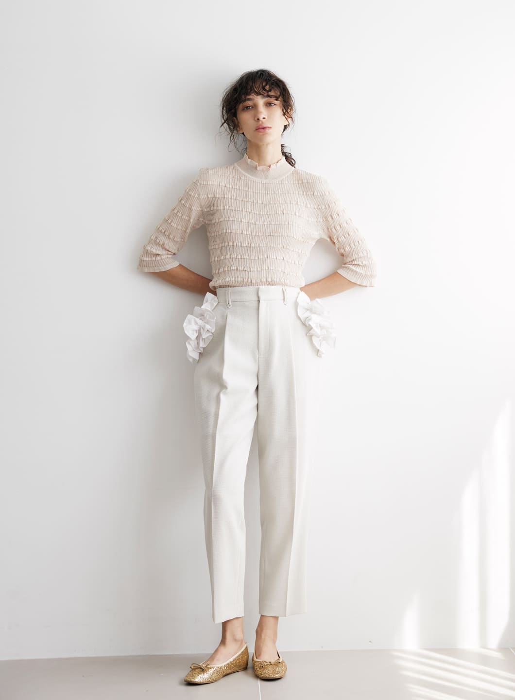 美脚シルエットにこだわったシンプルなテーパードパンツに、取り外し可能な別布フリルをあしらいフェミニンなデザインにしました。