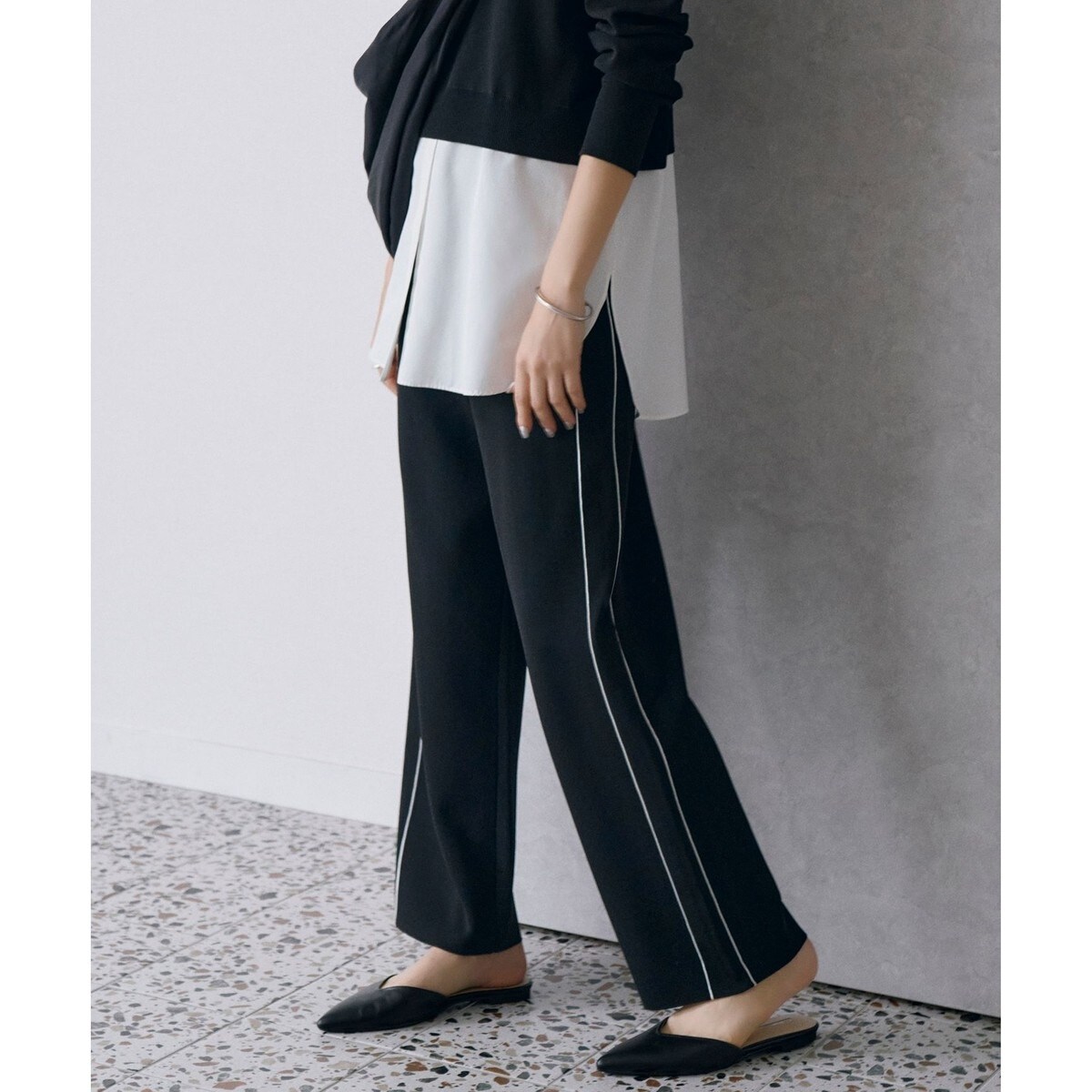 ■デザイン大人が着るトラックパンツをコンセプトに、細めの配色ラインを効かせたニットパンツです。ジャガードのニット地に仕立てることでジャージーのような表面の質感と、シルエット映えを両立し360度どこから見ても綺麗なシルエットに拘りました。ウエストはゴム仕様なので、レングスを調節することも可能です。