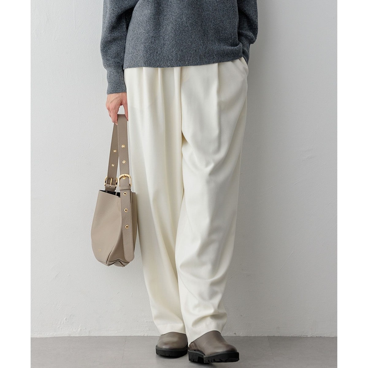 トレンド感があるボリュームが魅力のバレルパンツ。バレルパンツは「少し丸みのある樽(バレル)の様な力の抜けたシルエットのパンツ」の意味の通り、こなれ感のある大人カジュアルなスタイリングが作れるNEWボトムです。ウエストはぐるりと全面ゴム仕様で内側には紐でさらに調節ができるようになっています。カラーは、モードな雰囲気が漂うグレー(#004)、知的な印象できれいめにも着まわしやすいダークネイビー(#075)、冬のスタイリングを明るく見せるアイボリー(#002)の3色展開です。