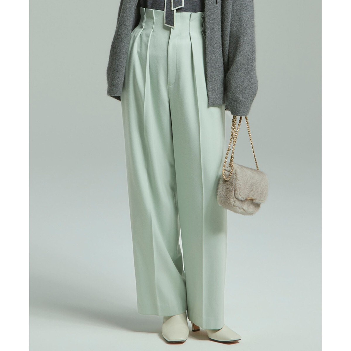 ハイウエストの2タックワイドパンツ。ウエスト位置が高いためスタイルアップして見えます。シワになりにくくきれいな表面感のウール混ツイル素材を使用。程よくゆとりのあるワイドシルエットで、トップスのデザインを選ばずスタイリングできる万能パンツです。ウエストの後ろはゴム仕様で伸縮性があるので穿き心地も◎カラーは、モードな雰囲気が漂うグレー(#004)、知的な印象できれいめにも着まわしやすいダークネイビー(#075)、冬のスタイリングを明るく見せるミント(#063)、アイボリー(#002)の4色展開です。