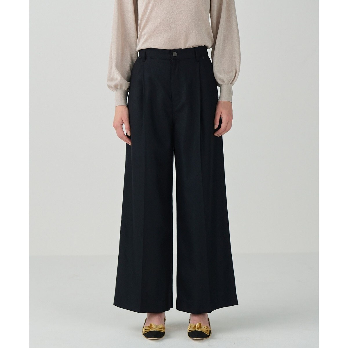 オンオフ兼用でご活躍いただけるウールワイドパンツ。カシミヤのような光沢を持ち、ソフトで膨らみのある上質なストレッチサキソニーを使用。綺麗めな生地をあえてデニムのようなディテールで作った、大人カジュアルなデザインがポイントです。フロントにタックを入れたワイドなラインながらも、腰回りはすっきりとさせ、シルエットにメリハリを効かせてルーズ過ぎないスマートなデザインに仕上げました。万能なブラックに、シャレ感がアップするグレー、上品見えするキナリの色違いで揃えたくなるベーシックカラーをご用意しました。