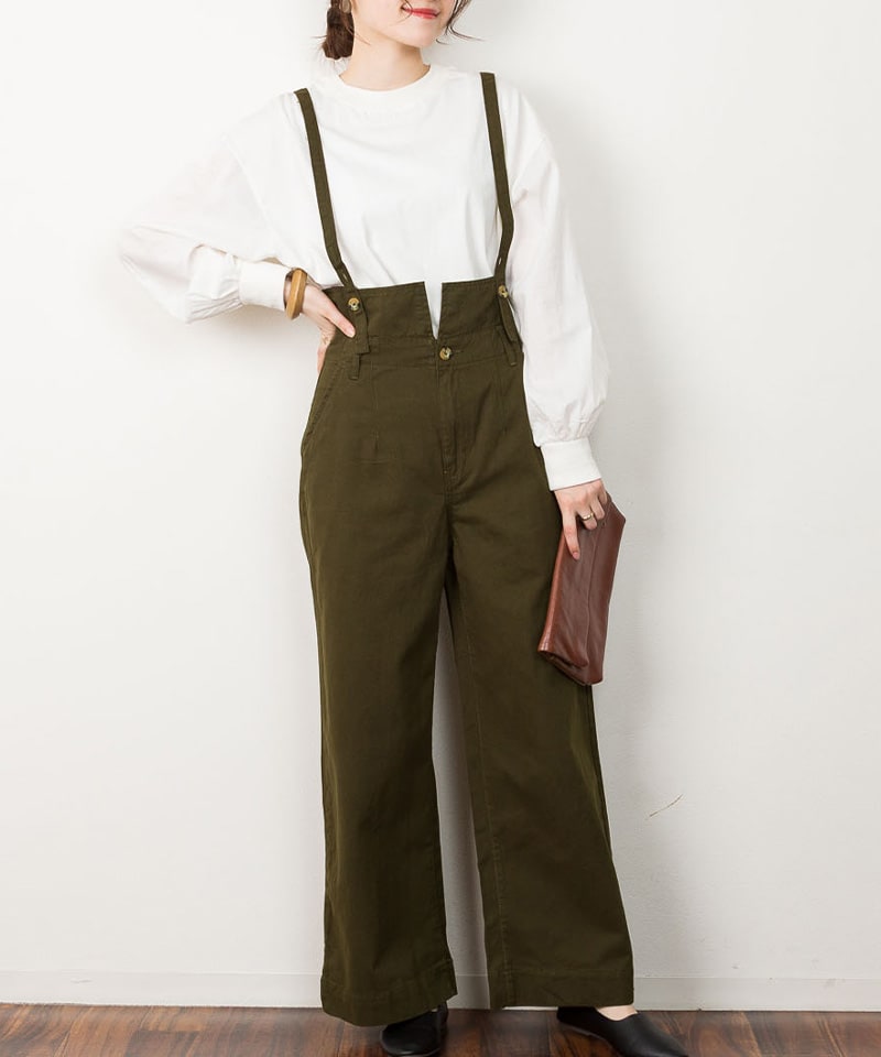 すっきり綺麗、サスペンダー付きハイウェストツイルパンツ。