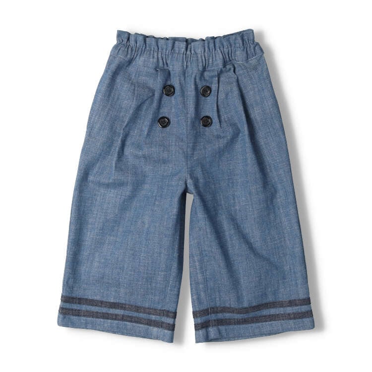 裾ラインと飾りボタンがマリンイメージな、7分丈のデニムワイドパンツです。シンプルだけど、1枚でオシャレなコーデに◎トップスをインしてもアウトしても、おしゃれに決まるアイテムです。【アイテム】ナチュラル シンプル ベーシック フェミニン ガーリー 無地 カジュアル お洒落 オシャレ かわいい 大人可愛い 普段着 デイリーウェア お出かけ着 お外着 外遊び着 ハーフパンツ 短パン 半パン 半ズボン ボトムス 子ども こども 女児 女の子 ガールズ キッズ ベビーサイズ トドラーサイズ 幼稚園 保育園 小学校 通園 通学 小学生 2024年春夏物新作 丸高衣料 ブルー 青色 ムージョンジョン
