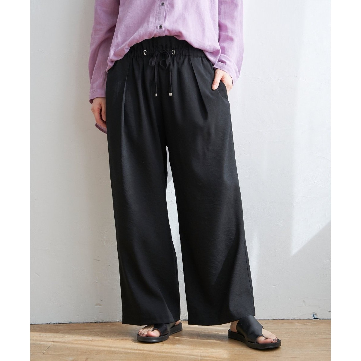 ワイドシルエットでもきれいな落ち感のある夏定番のワイドパンツ。