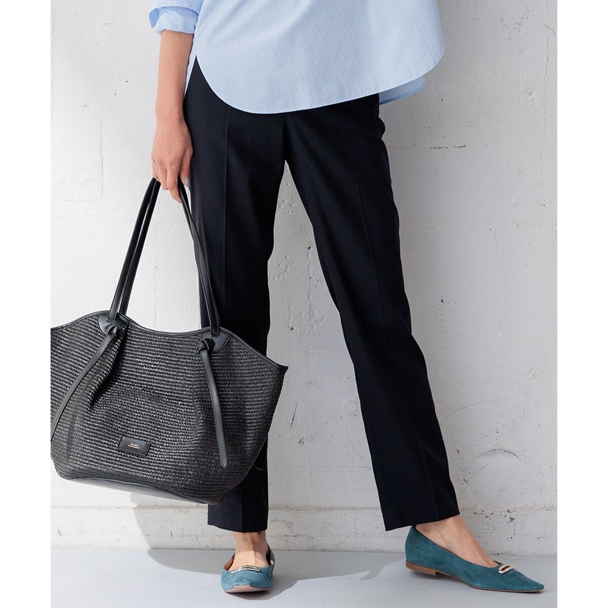 いつでも1本は常備していたいスタイリッシュな23区定番テーパードパンツ。どんなトップスにも合わせやすく、オフィスでもデイリーにも万能に活躍できる様、すっきりとした細身なシルエットに仕上げています。ウエストの後ろにはゴムで伸縮性を持たせ、ストレスのない履き心地です。同素材のジャケットとキレイ目セットアップで着たり、単品使いでカジュアルにも着こなせる、着回し抜群のパンツです。カラーは、女性らしく清潔感溢れるベージュ(#033)、大人上品なネイビー(#075)、どんなシーンにもお使いいただけるブラック(#005)の3色展開です。