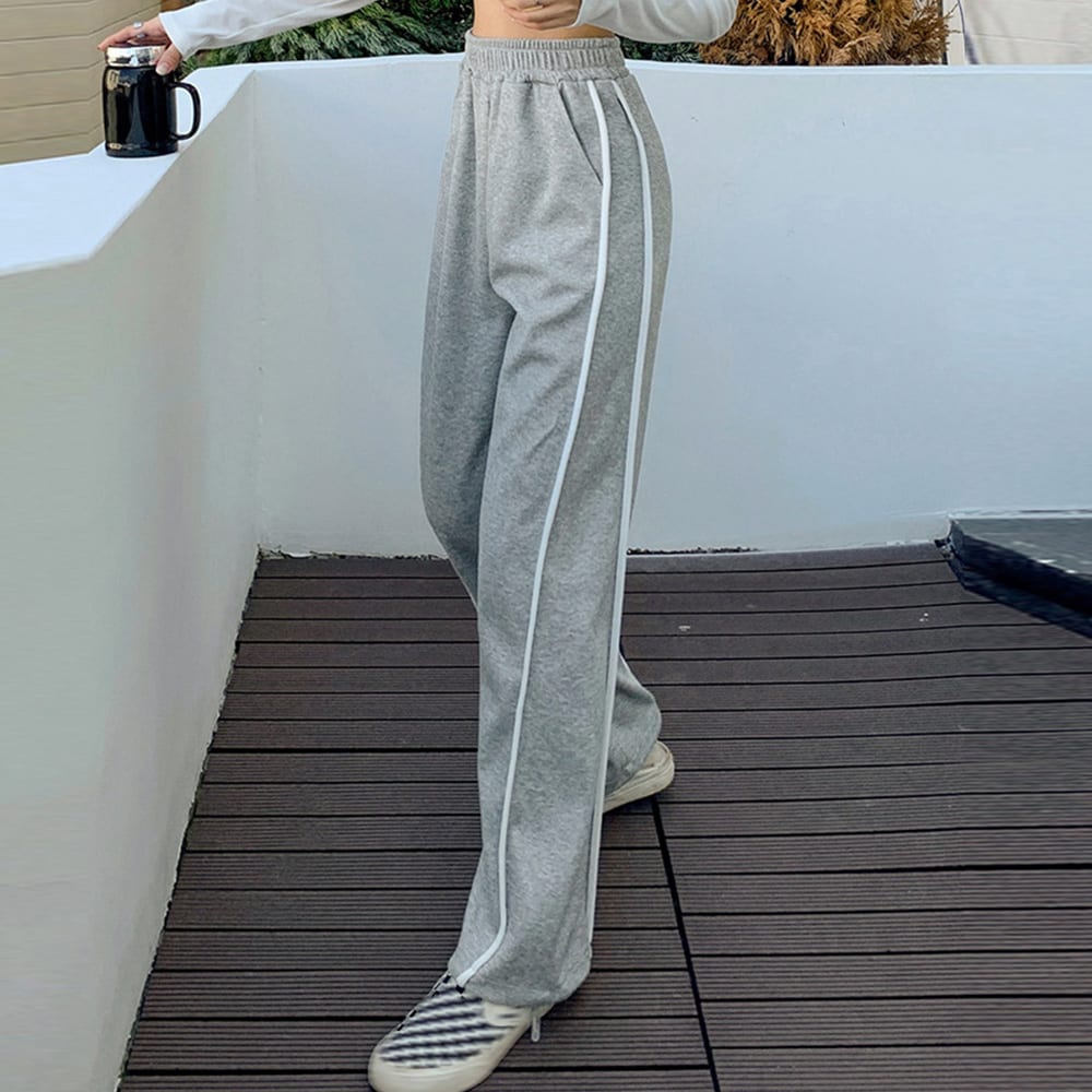 両サイドに裾に向かって緩やかに広がる2本ラインデザイン、脚をすっきり魅せるスウェットパンツ