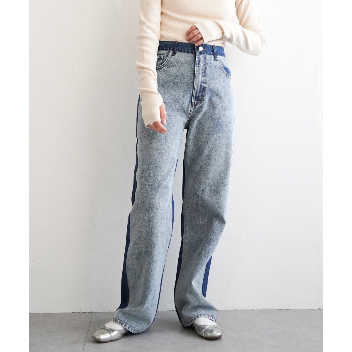 濃い色のデニムと切り替えることで、前から見た時の細見え効果も◎