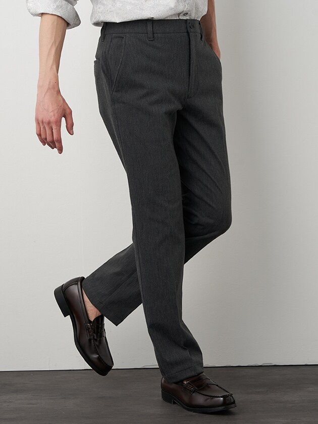 裏起毛のやわらかさと動きやすさが特徴のスリムスラックス。表面はカルゼ調のしっかりとした布帛見えの外観で、肌触りはやわらかく暖かいタッチに仕上がっています。タテヨコ2方向にのびるストレスを感じさせない履き心地と、安心の地厚感がおすすめのポイントです。定番のベージュ、ネイビーとダークグレーの3色展開。シルエットは【甘やかし】シリーズと同様のスリムタイプです。ウエストはストレッチインベルを採用し、体の動きに合わせて少し伸びる仕様になっています。