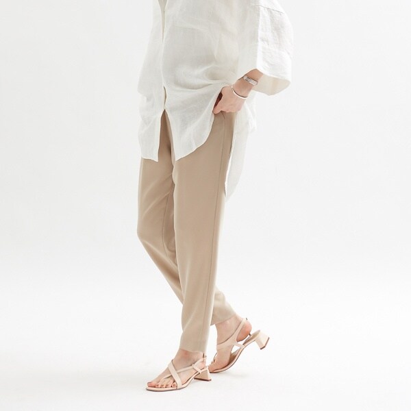 ベーシックなテーパードパンツは、合わせるトップスでON/OFF兼用できる穿き着回しパンツ。