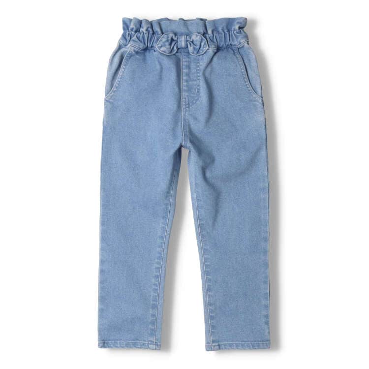 ウエスト部分がフリルのようなデザインでリボンも付いているので、トップスをインして着ても可愛い!ゆったりテーパードシルエットがお洒落なデニムパンツ。程よい肉感のストレッチデニムです。【アイテム】ナチュラル シンプル ベーシック フェミニン ガーリー 無地 カジュアル お洒落 オシャレ かわいい 大人可愛い 普段着 デイリーウェア お出かけ着 お外着 外遊び着 ロング丈 長丈 長ズボン フル丈 ボトムス 子ども こども 女児 女の子 ガールズ キッズ ベビーサイズ トドラーサイズ 幼稚園 保育園 小学校 通園 通学 小学生 2023年秋冬物新作 丸高衣料 ブルー 青色 Gパン ジーパン ムージョンジョン