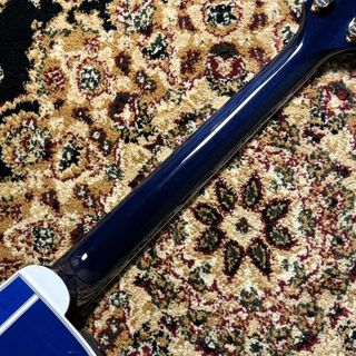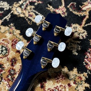 特注のBMSカラーと美しいメイプルの杢目が鮮やかに目を引き、加えてパールのピックガードと糸巻き、ダイヤモンドのポジションマークが全体の洗練されたイメージを際立たせます。