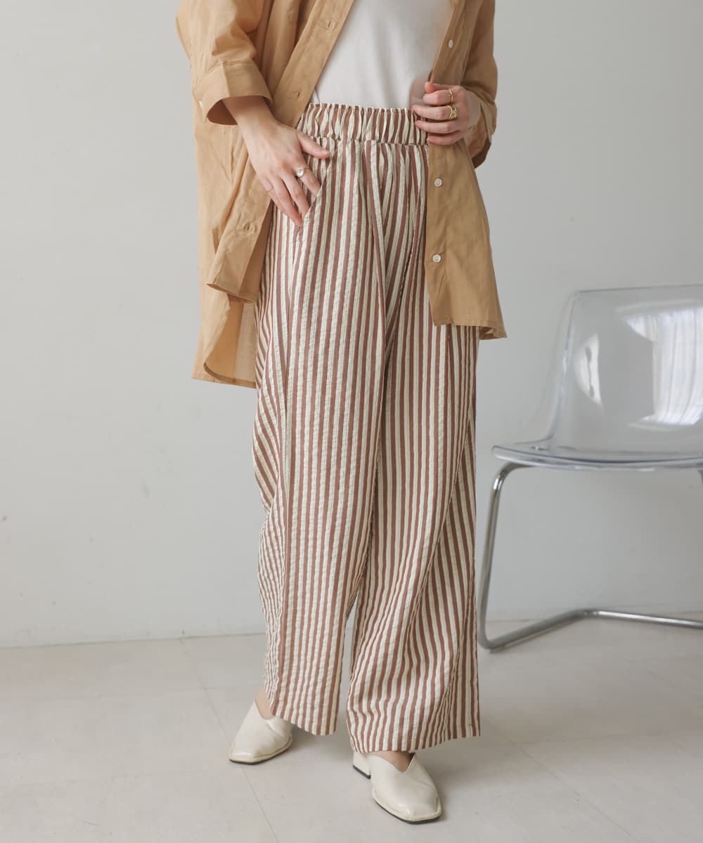 y8新品・送料無料★callautia 7759円★ストライプ柄 ルーズ ワイドパンツ イージーパンツ サッカー生地★Sサイズ ブラック黒 カラウティア