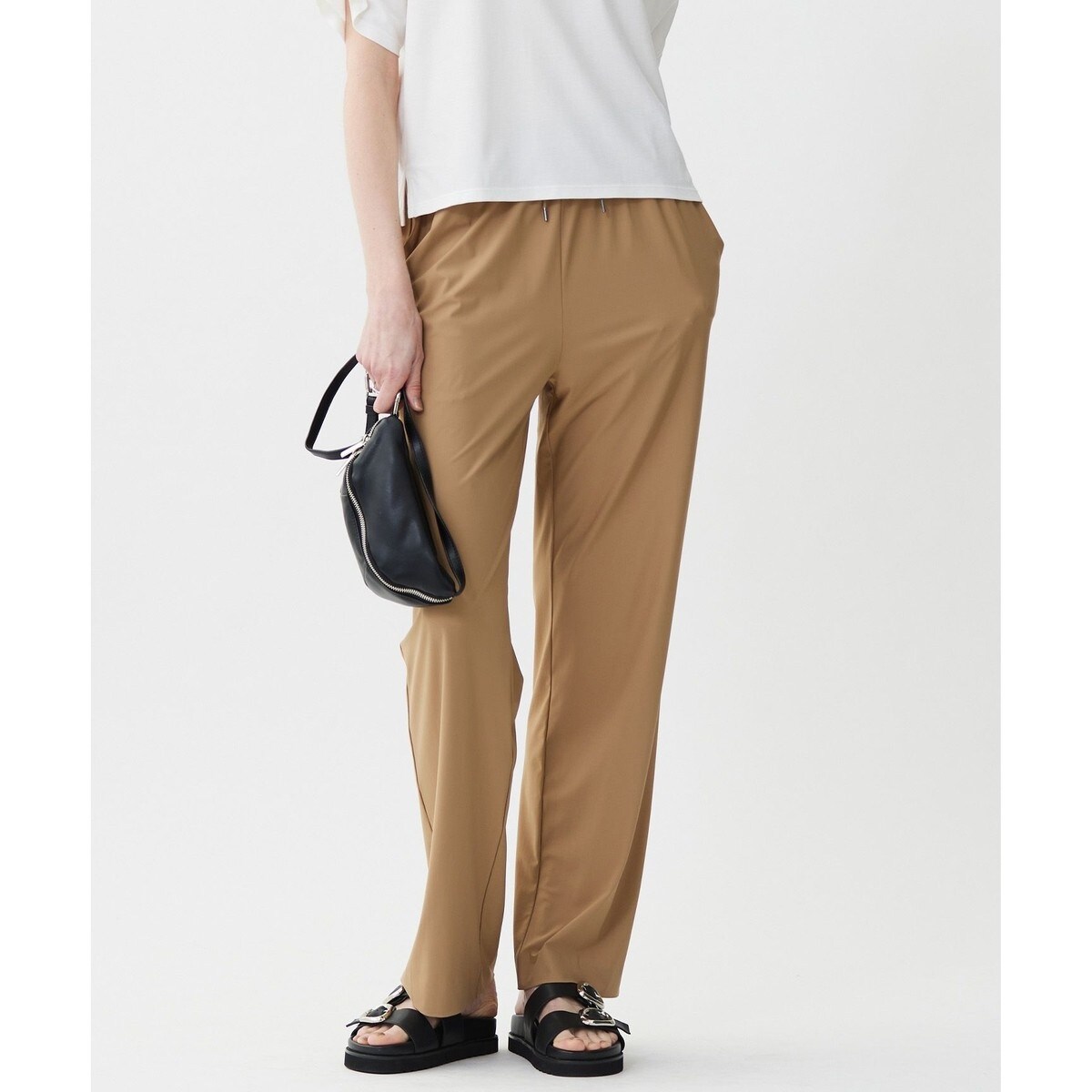 ■デザインストレートシルエットのセミワイドパンツです。イージーな穿き心地ながら、カジュアル過ぎずお仕事にも活躍します。単品使いはもちろん、同素材のトップス合わせでセットアップでの着用もおすすめです。