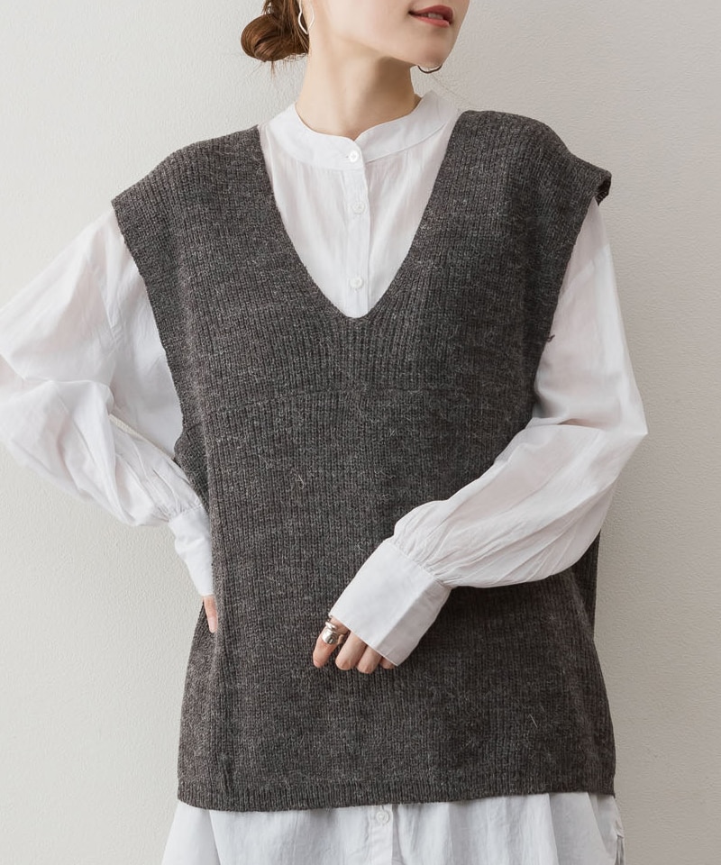 すっきりとしたネックラインで重ね着スタイルにおすすめなニットベスト。