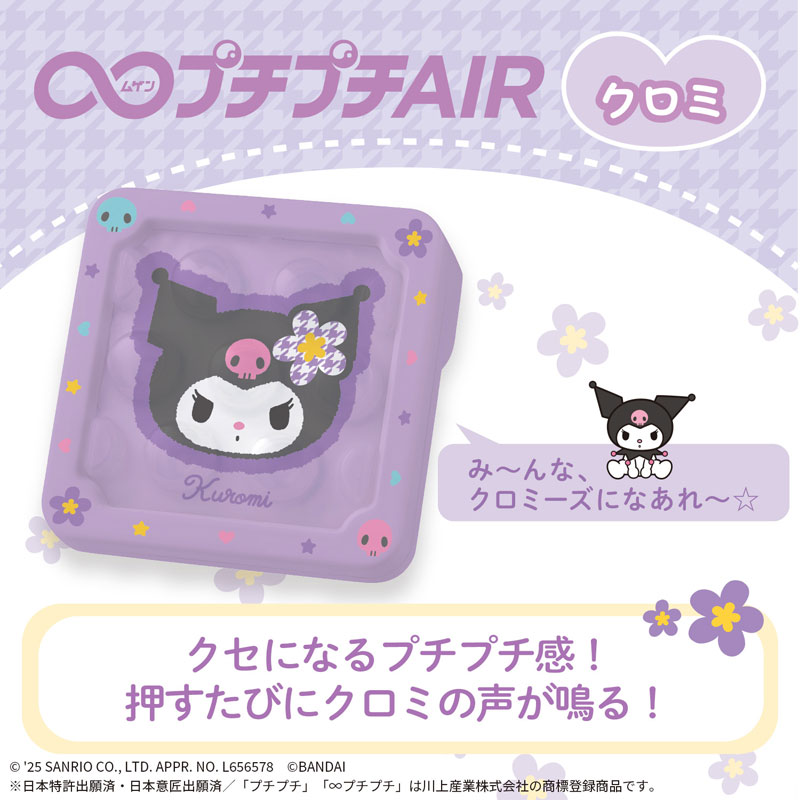2007年に大ヒットした「∞プチプチ」にクロミver.が登場! 空気を閉じ込めた特殊構造のボタンを押すと、心地よいプチっと感と共にクロミの声が流れます。 ランダムでレアな音声も出現し、何度も押したくなる仕様です!