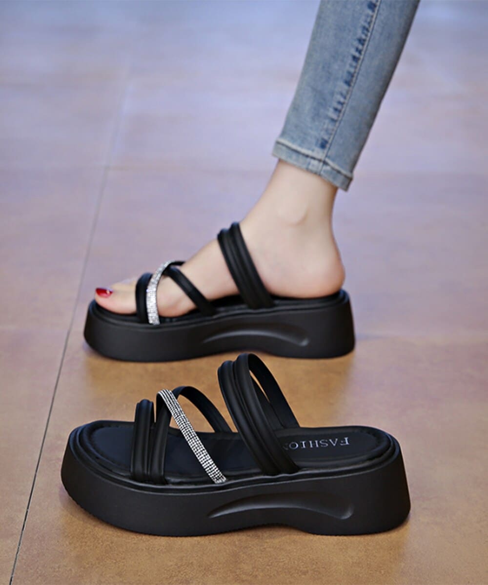 シンプルでモダンなデザインのラインストーン付き厚底サンダル。