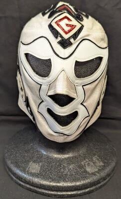 プロレスマスク プロレスコスチュームセット マスク/ブシオ製【ドラリスティコ (白特殊×白ラメ・金ホロ・赤ラメフチ)】タグなし 本人使用 着用写真付き