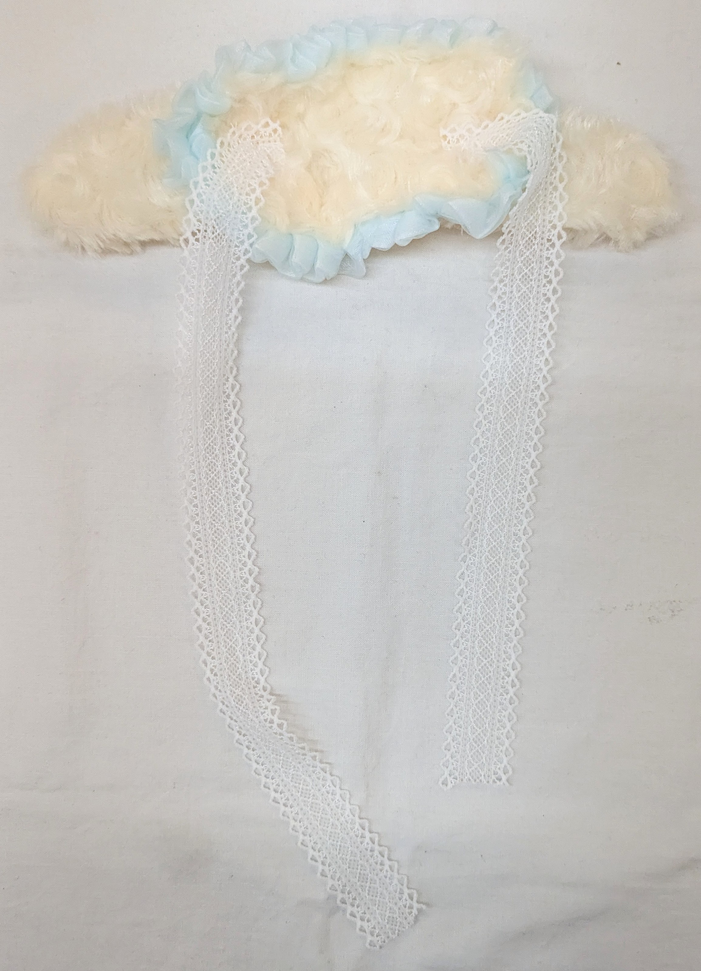 手編み フリル付きネコのヘッドドレス 水色×ホワイト