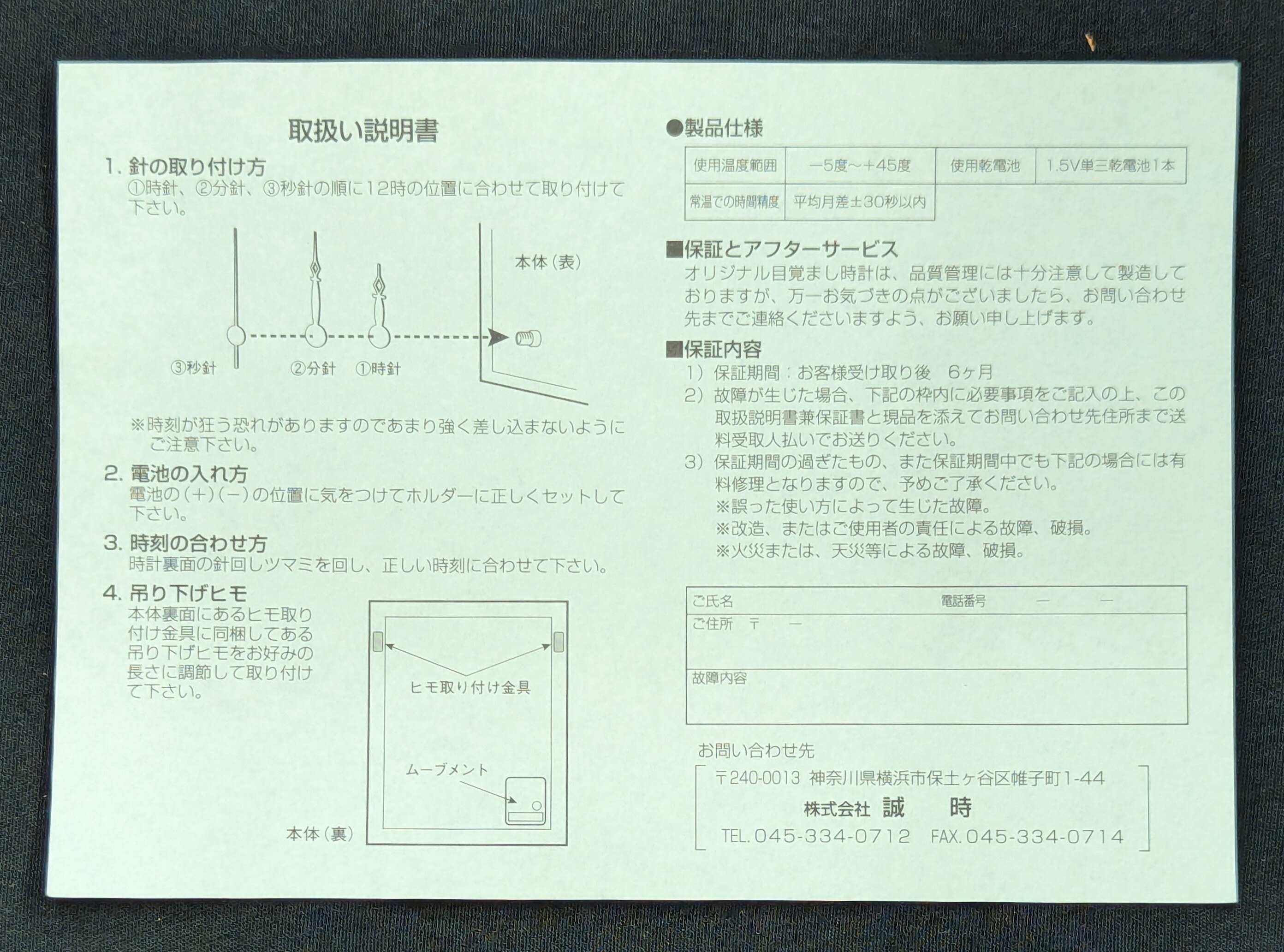 商品状態: 開封/時計針袋・吊り下げヒモ袋未開封/パッケージいたみ※ヘコミ・ツブレ