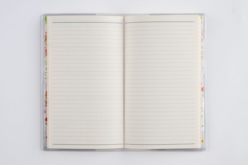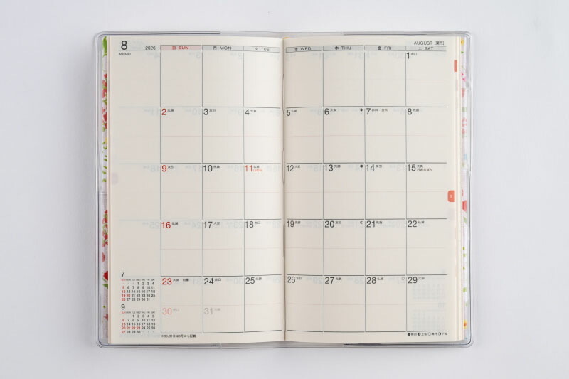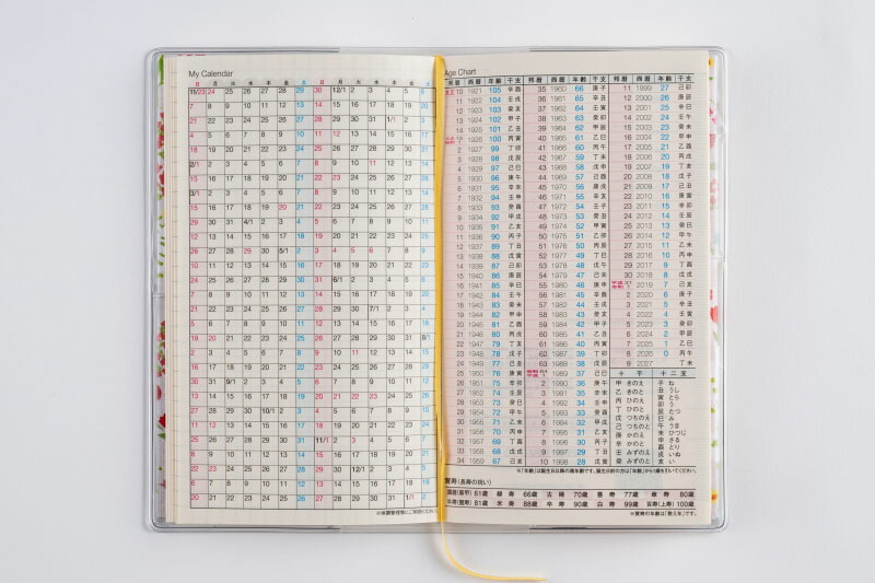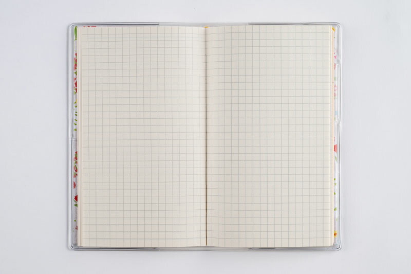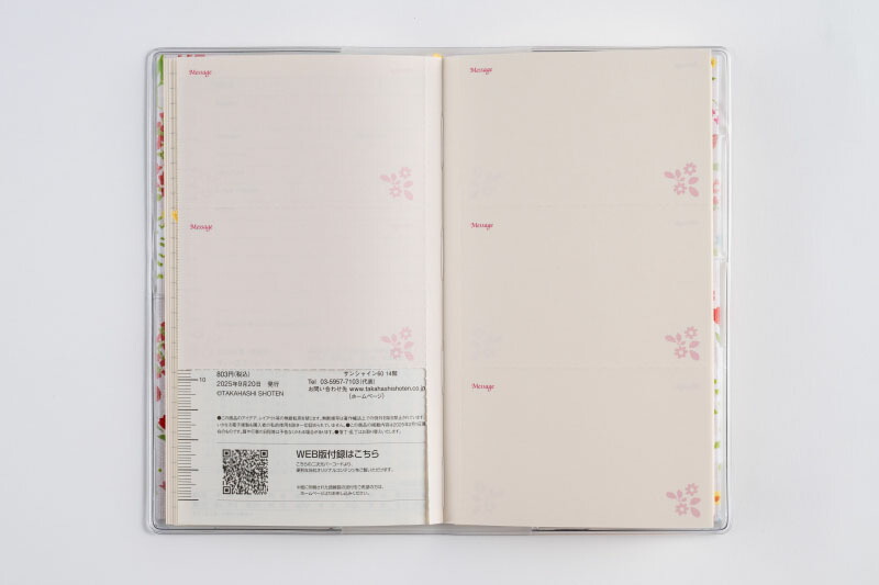 巻末には横ケイメモページ、方眼メモページ、花柄の切り取りメモ付き。