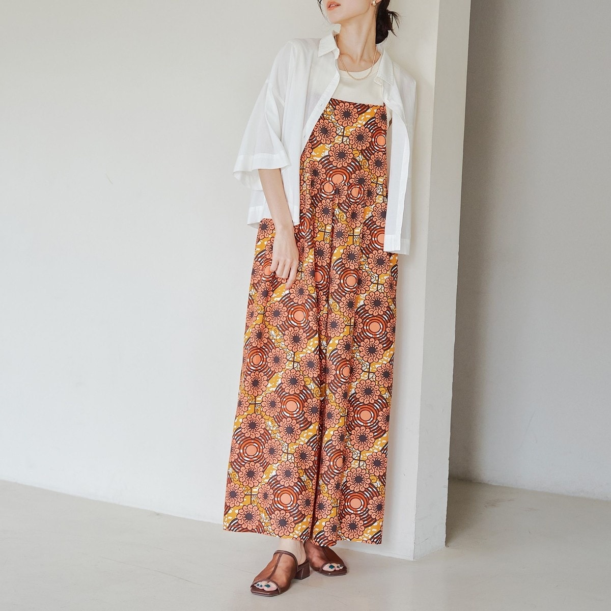 ●肩紐での調整に加え、厚底サンダルを合わせることで小柄な方もバランスよく着こなせます