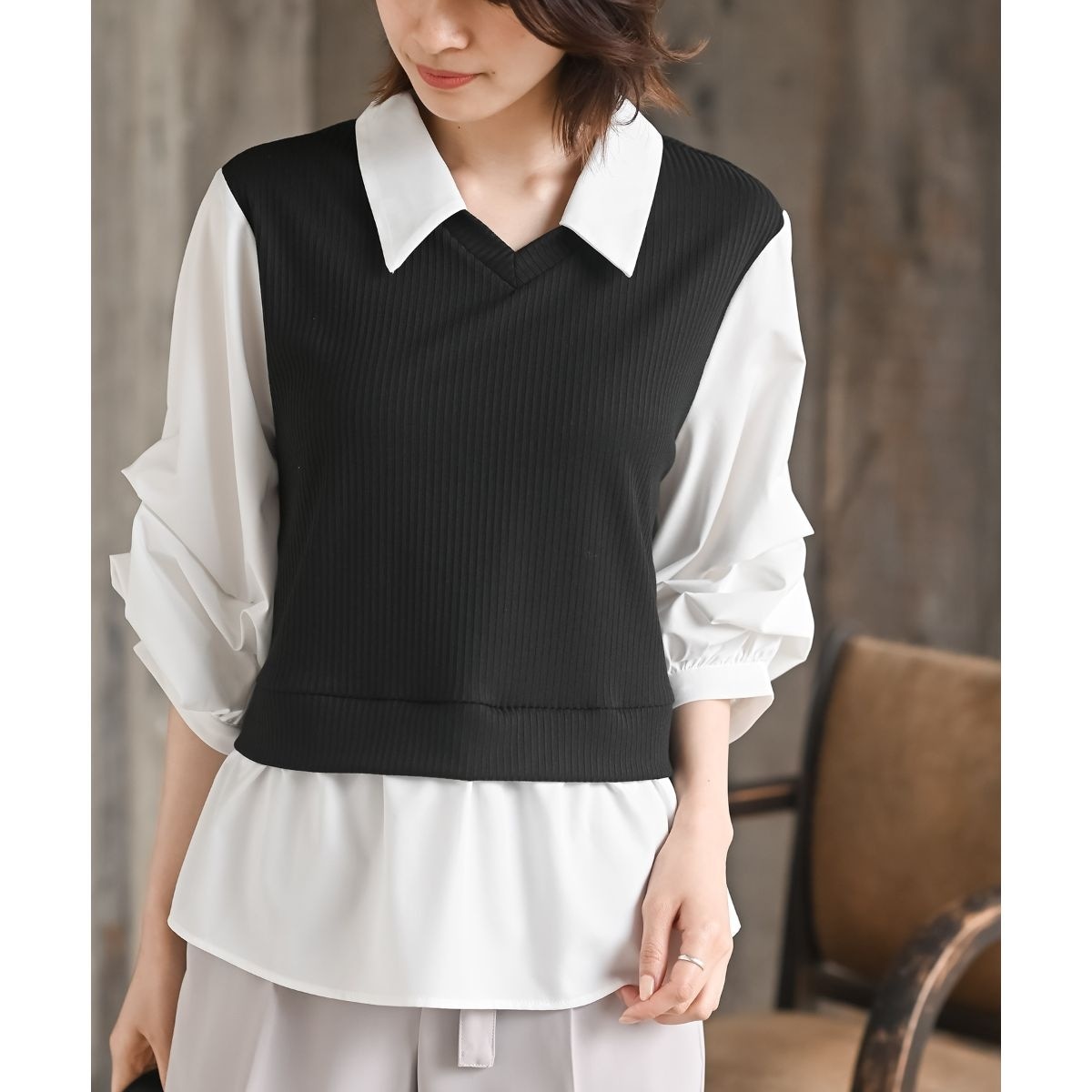 変形タックスリーブ衿付きドッキングブラウス