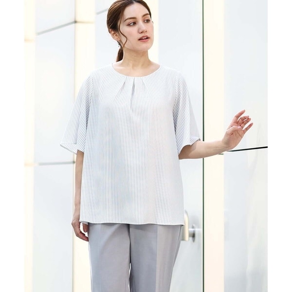 ナチュラルビューティーベーシック ストライプブラウス【M】タック パフスリーブ