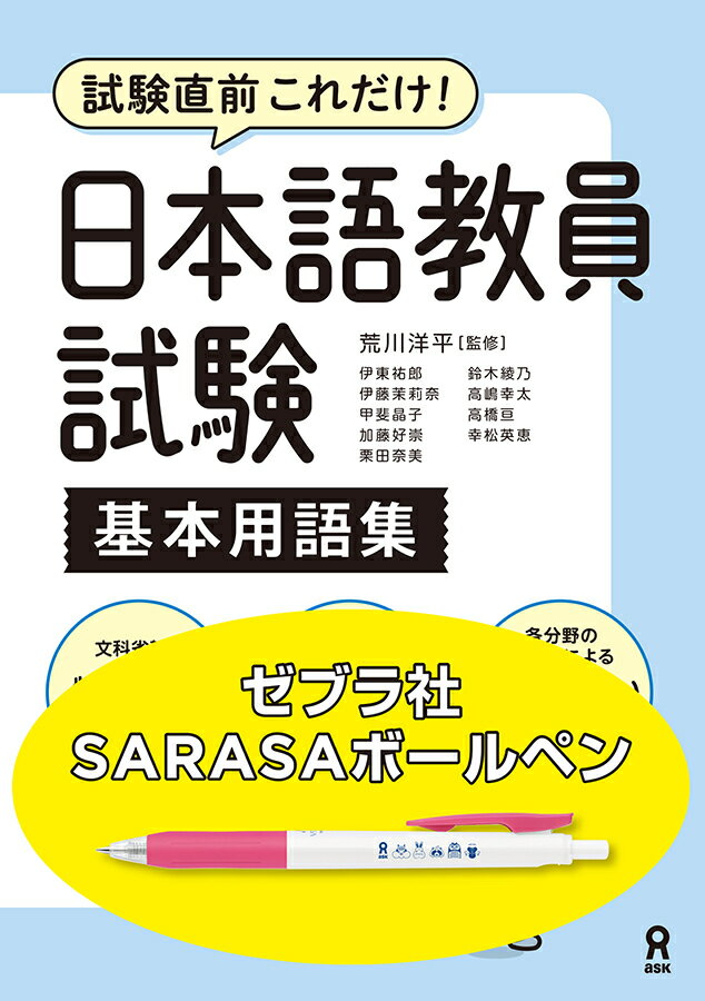 <<刊行記念>>アスク出版の水性ボールペン(ゼブラ社 SARASA)が1本付録した「数量限定版」になります。文部科学省が実施する国家資格の新試験「日本語教員試験」に完全対応の用語集です!『日本語教員試験 基本用語集』厳選した約1,000語を収載。文科省の出題範囲に対応しつつ、独学者が学びやすいよう文部科学省カリキュラムの構成を再編成しました。「日本語教員試験 攻略テキスト」とセットで使用して、知識を深めることができます。■ 本書の特徴?頻出分野に特化した独自の構成。必須の教育内容に対応のキーワードを網羅的に学べる。2本試験の傾向を踏まえ本当に必要な語彙を厳選、要点をスピーディーに確認できます。3日本語教育各分野の専門家たちが解説を執筆。 直前対策に最適な「オンラインテスト300問」の付録つきで、独学者におすすめです。■ 著者紹介(50音順)[監修]荒川洋平 東京外国語大学 国際日本学研究院 教授[執筆者]伊東祐郎 国際教養大学専門職大学院 日本語教育実践領域 特命教授 元日本語教育学会会長 東京外国語大学名誉教授 ?第4章(16.評価法とテスト)伊藤茉莉奈 東京経済大学 全学共通教育センター 特任講師 ?第1章(2.日本語の音声と音韻)甲斐晶子 青山学院大学 助教 ?第4章(17.著作権とICT)加藤好崇 元 東海大学教授 ?第2章(9.社会言語学、10.待遇表現とポライトネス)栗田奈美 拓殖大学日本語教育研究所 教授 ?第1章(3.日本語の文字と表記、4.日本語の語彙と意味)鈴木綾乃 横浜市立大学グローバル都市協力研究センター 日本語担当准教授 ?第2章(6.語用論と会話・談話分析、8.異文化研究) 第3章(11.心理と記憶、12.言語習得)高嶋幸太 立教大学 日本語教育センター 兼任講師 ?第2章(7.コミュニケーション)、第4章(13.教授法、14.コースデザインと実習、15.授業分析と教師の成長)第5章(19.多文化共生、20.日本語教育の歴史と現在)高橋亘 目白大学外国語学部 日本語・日本語教育学科 専任講師 ?第1章(1.言語学) 第5章(18.言語政策と外国人施策)幸松英恵 東京外国語大学大学院 国際日本学研究院 准教授 ?第1章(5.日本語教育の文法)【出版社より】文部科学省『日本語教師の学び直し』シリーズを制作!日本語教育のトレンドをつかんだアスク出版だからできる充実の内容になっています。基礎試験受験者の方にとってもわかりやすい文言で、ゼロから解説。また、著作権・ICT・「日本語教育の参照枠」分野の練習問題もあり、ベテランの先生の学び直しにも使えます。【著者略歴】荒川 洋平(あらかわ ようへい)東京外国語大学教授(国際日本学研究院)。1961 年 東京生まれ。立教大学文学部仏文科卒業。ニューヨーク大学教育大学院修了。デューク大学助手、国際交流基金日本語国際センター専任講師、東京外国語大学助教授を経て、2014 年から現職。専門は応用認知言語学、国際言語管理。著書に『もしも…あなたが外国人に「日本語を教える」としたら』、『続・もしも…あなたが外国人に「日本語を教える」としたら』(スリーエーネットワーク)、『日本語教師のための応用認知言語学』(共著・凡人社)、『日本語という外国語』(講談社)、『日本語多義語学習辞典 名詞編』(編著・アルク)、『デジタル・メタファー ことばはコンピューターとどのように向き合ってきたか』(東京外国語大学出版会)、『日本語教育のミカタ』(凡人社)、『国際コミュニケーションマネジメント入門』(編著・アスク出版)などがある。