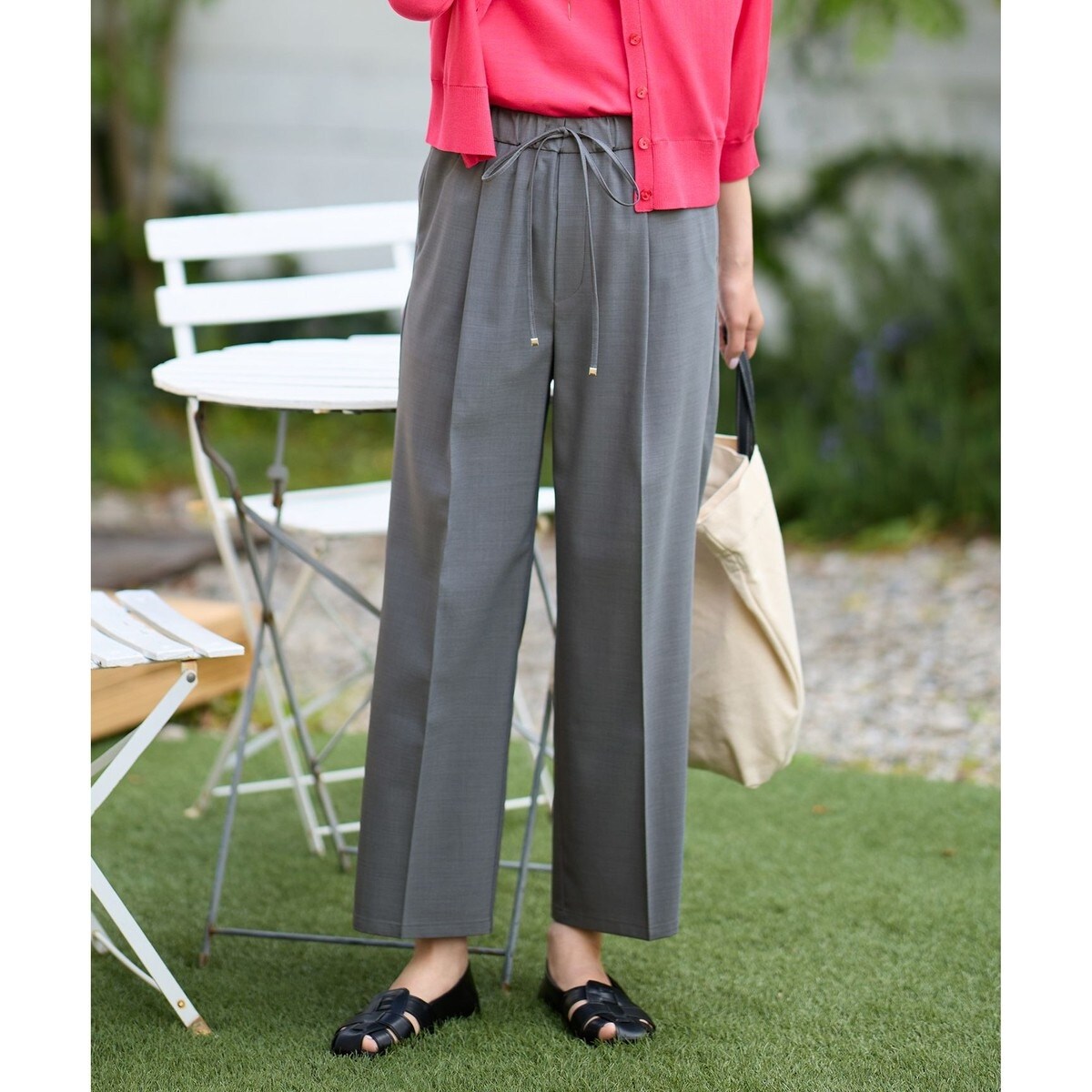 ・さらりとした落ち感のある素材で、きれいめにもカジュアルにも着回せるパンツ・センタープレスがきちんと感をプラスしてくれる・ウエストはゴム仕様で楽な着心地ながらも、スタイルのアクセントになるデザイン