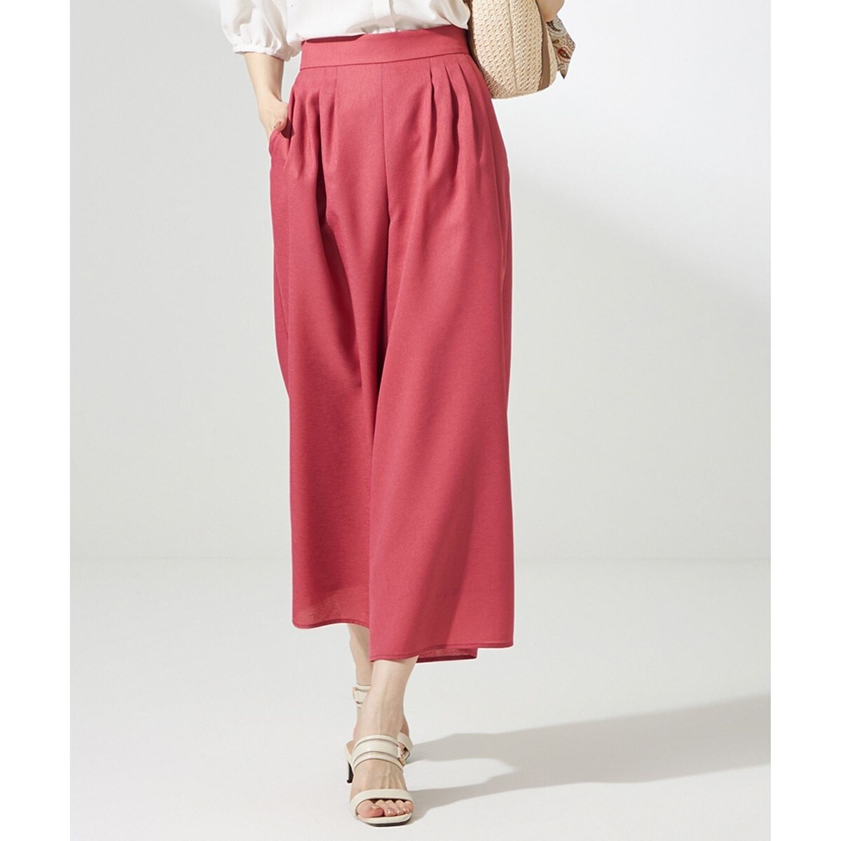 ・たっぷりとした分量感のタックフレアパンツ・体型をカバーし、穿くだけでサマ見えする一着・細かく入ったタックデザインが程よくリラクシーな雰囲気に・軽く柔らかいマット裏地を使用し、透け感をカバーしながら涼やかな印象