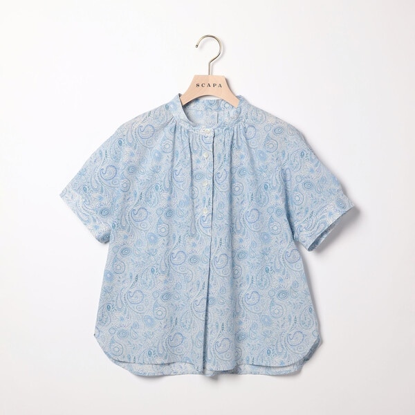 エスニック感あふれるペイズリー柄を、淡く明るい配色でデザインしたブラウス。スタイリッシュな印象のスタンドカラーを採用しています。衿回りにはさりげなくギャザーを施して、フェミニンをプラス。薄手の生地感の軽やかさが夏らしいリゾートコーディネートにもぴったりです。着丈は少し短めですっきりと着こなせます。