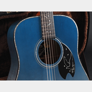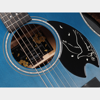 ボディ各部には、石川県の県鳥「イヌワシ」のモチーフが随所に取り入れられており、ピックガードにもその姿が描かれています。ヘッドから指板にかけては、イヌワシの羽と桜が舞い落ちる情景がダイナミックに表現され、バックのセンターピースには昇る朝日に向かって飛び立つイヌワシの姿が刻まれています。これは、これからの未来に向かって力強く羽ばたいていく姿を象徴したものであり、本機に込められた想いを雄弁に語ります。さらに指板インレイには、淡い桃色の素材を使用してソメイヨシノの花びらを表現。桜ギターならではの可憐で上品な美しさを添えています。