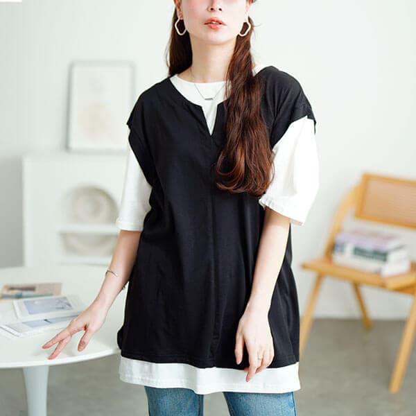 パッと一枚着るだけで手抜きに見えないお洒落な重ね着風☆接触冷感フェイクベストコットンプルオーバーの登場です!大人気のベストを重ね着したかのようなお洒落上級者のレイヤードデザイン!ボディラインを拾わないゆったりラフなサイズ感で華奢見せ効果も抜群です◎お尻が隠れる長めの着丈なのでぽっちゃりさんが敬遠しがちなタイトなボトムスも視線を気にせず穿けちゃいます♪ひんやり冷たい接触冷感×綿100%生地で、吸湿性・通気性に優れしっかり汗を吸い取るので暑い季節も快適にご着用いただけます◎