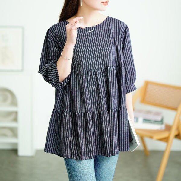 ふんわりティアードのシルエットで、どこから見てもキュンとする可愛らしいスタイリングに仕上がるチュニック。さっと着られるプルオーバーで、ラフ感がありながらも、オンにもオフにもマッチする大人の女性らしいデザイン。シンプルだからコーデを選ばず、着こなしやすさも嬉しいポイント。ティアードのふんわり感で、お腹やヒップ周りをしっかりカバーし、ふっくら感のあるスリーブで二の腕を華奢見えさせてくれます。安心のチュニック丈だから、細身のボトムスにも挑戦しやすく、接触冷感機能付きだから、汗ばむ季節もひんやりと心地良い着心地に。