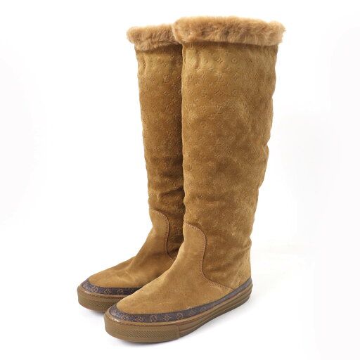 極美品★LOUIS VUITTON ルイヴィトン スノーボールライン モノグラム柄 ロング ムートンブーツ ブラウン 36.5 イタリア製 レディース【中古】
