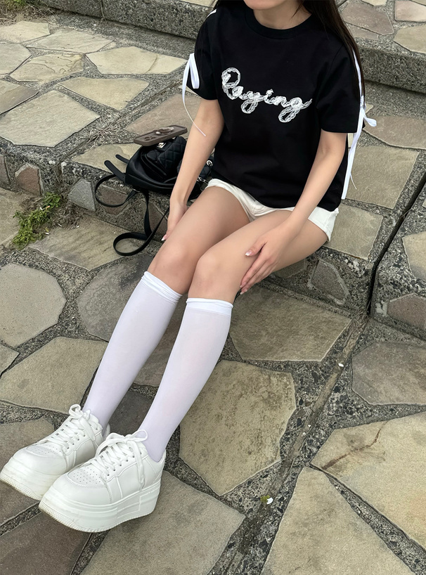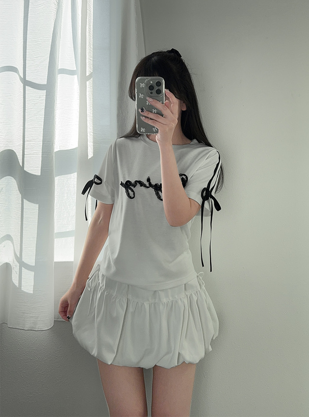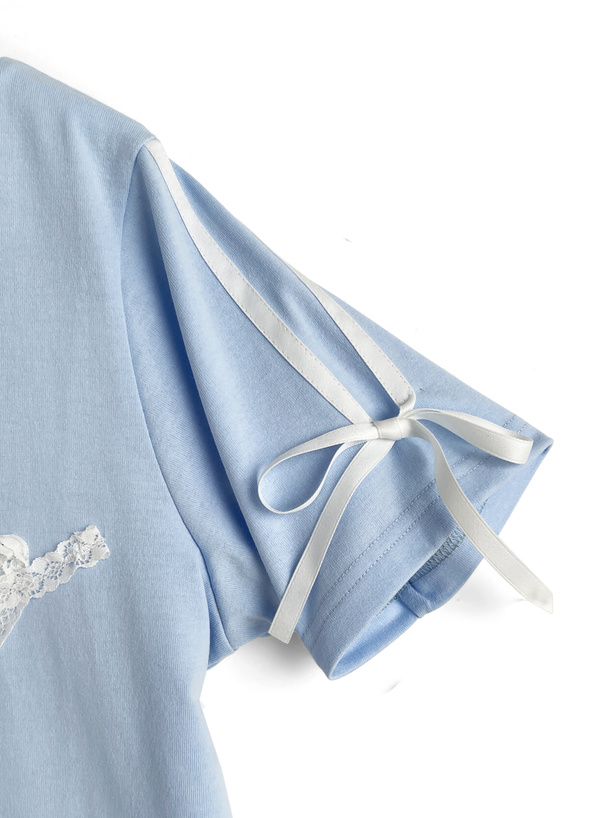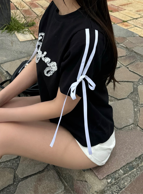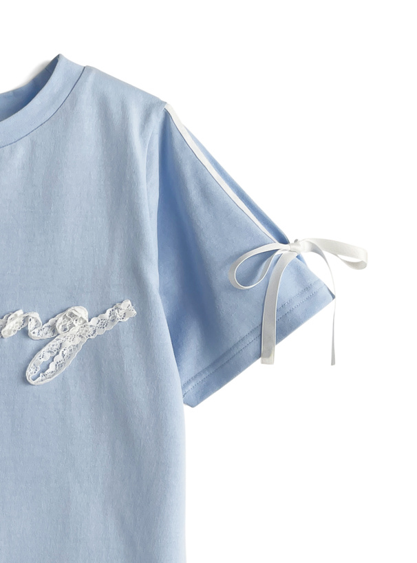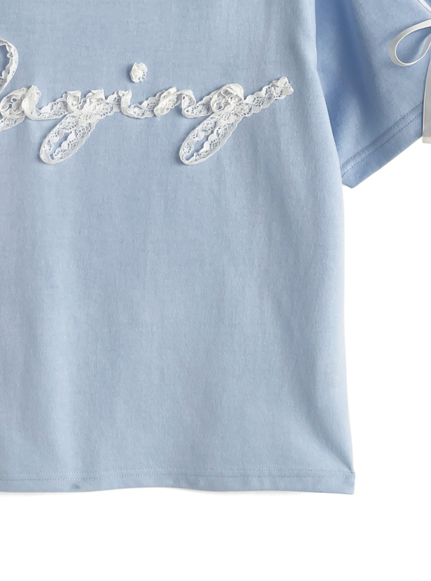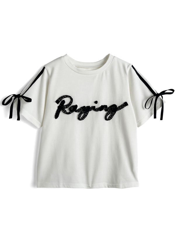 レースを縫い付けたロゴがフェミニンなアクセントになったTシャツ。