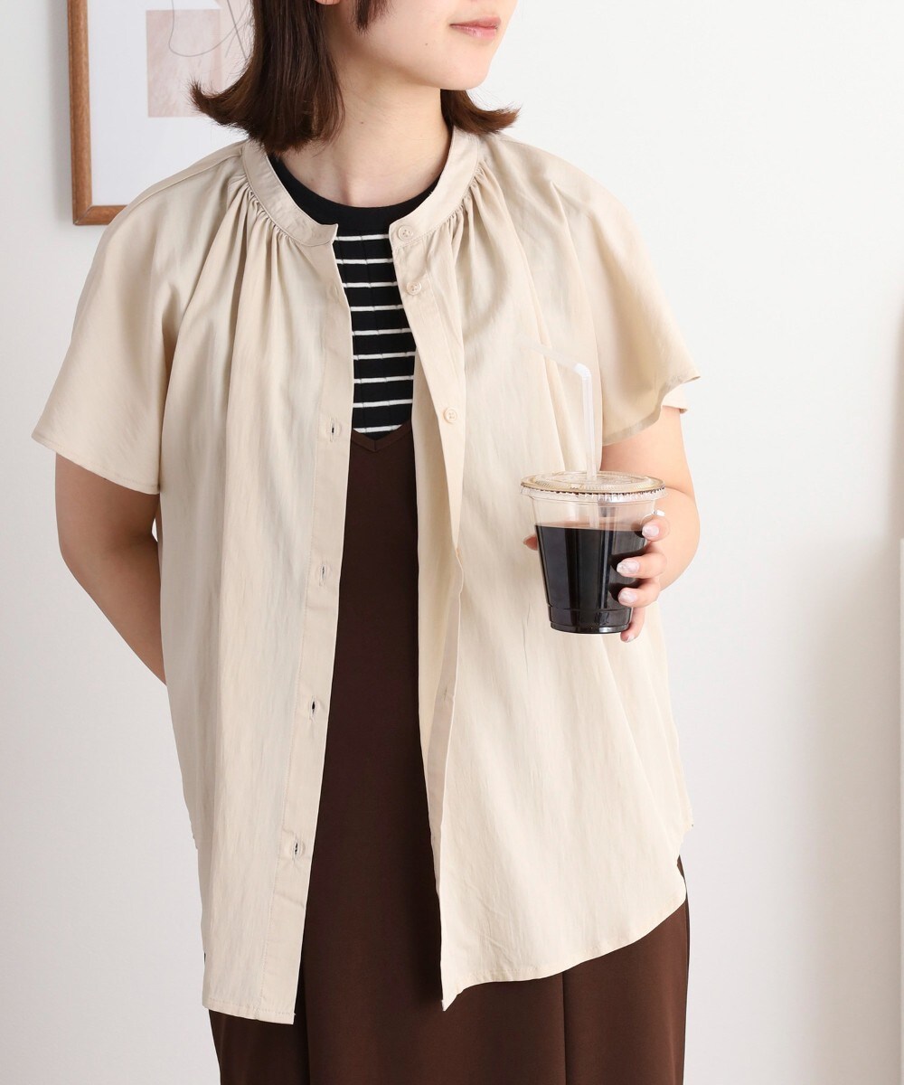 バンドカラーが顔まわりをすっきり見せ、オンにもオフにも対応する洗練された一枚です。