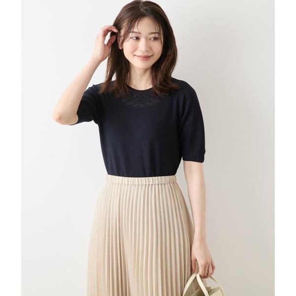 クルーネックの5分袖プルオーバー。襟周りに求心の透かし柄をぐるりと入れ、繊細なアクセントを加えました。小ぶりのネックラインと長めの袖丈でしっかりと身体を包みながらも、透かし柄が涼しげな印象を与えてくれます。